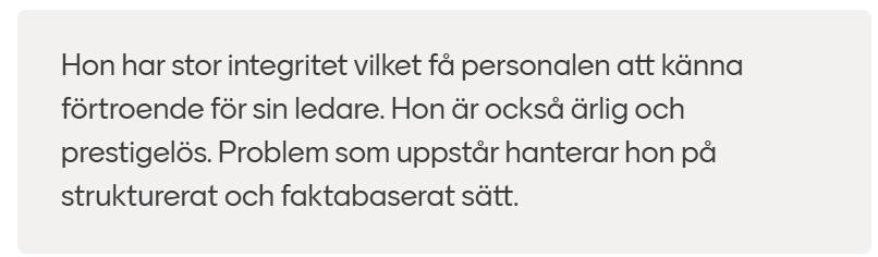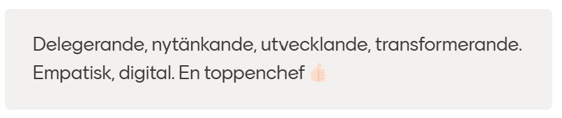 ”Du tar ditt ledarskap på stort allvar och är lyssnande och intresserad och hittar lösningar på svåra problem”